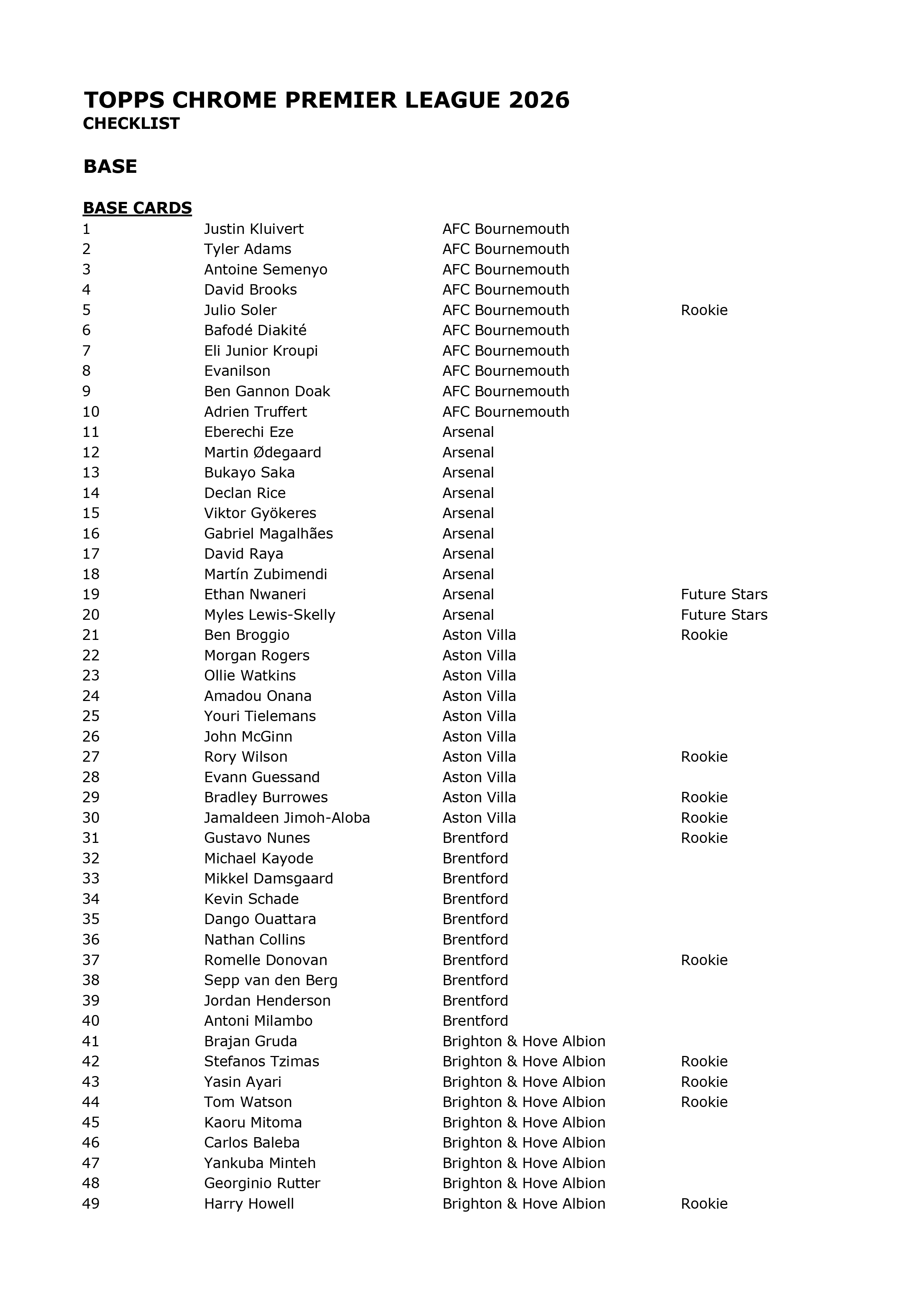 Topps Chrome Premier League 2026 brings with it a highly anticipated return, showcasing the Premier League at its Chrome best with a deep autograph checklist, dynamic inserts, and an impressive collection of elite stars. Build the entire 200-card Base Set across a rainbow of color and tech parallels! Look for On-Card autographs from the biggest stars including Mohamed Salah, Thierry Henry, and Wayne Rooney. Find rookie autographs of Max Dowman, Rio Ngumoha, and Estêvão Willian. Find 1 Chrome Autograph Card in Every Hobby Box! Find 2 Chrome Autograph Cards in Every Delight Box.